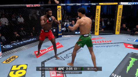 Sterling used his weird kicks, shifting stance, and loopy punches to confuse Zalal. Zalal was so bewildered he fell back to the cage too often to win the fight. Even when Zalal held the center, Sterling knew exactly how to counter Zalal’s mesmerizing footwork. Just look at the first definitive moment from the fight.