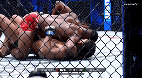 Zalal throws a left hand and a left knee. Sterling shoots. Zalal sprawls. Now Sterling’s hips are far away. Zalal locks up a guillotione as Sterling tries to move in. Sterling slams Zalal but ends up in his guard. Sterling tries to raise his hips and move his head to the center but Zalal’s hooks hold Sterling in place. He has to roll over so he doesn’t submit.
