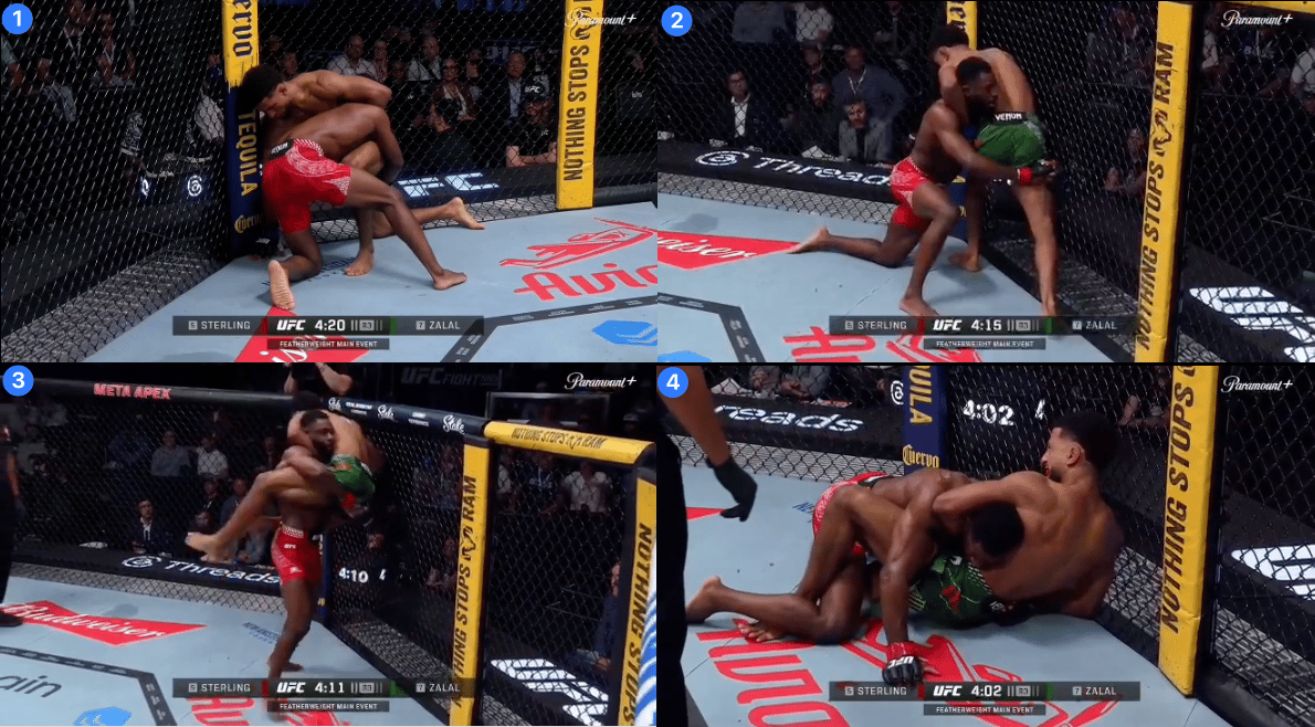 Zalal can’t plant his feet, fire back, and cover on the cage because that will give Sterling what he wants: an open avenue to shoot on Zalal’s hips.