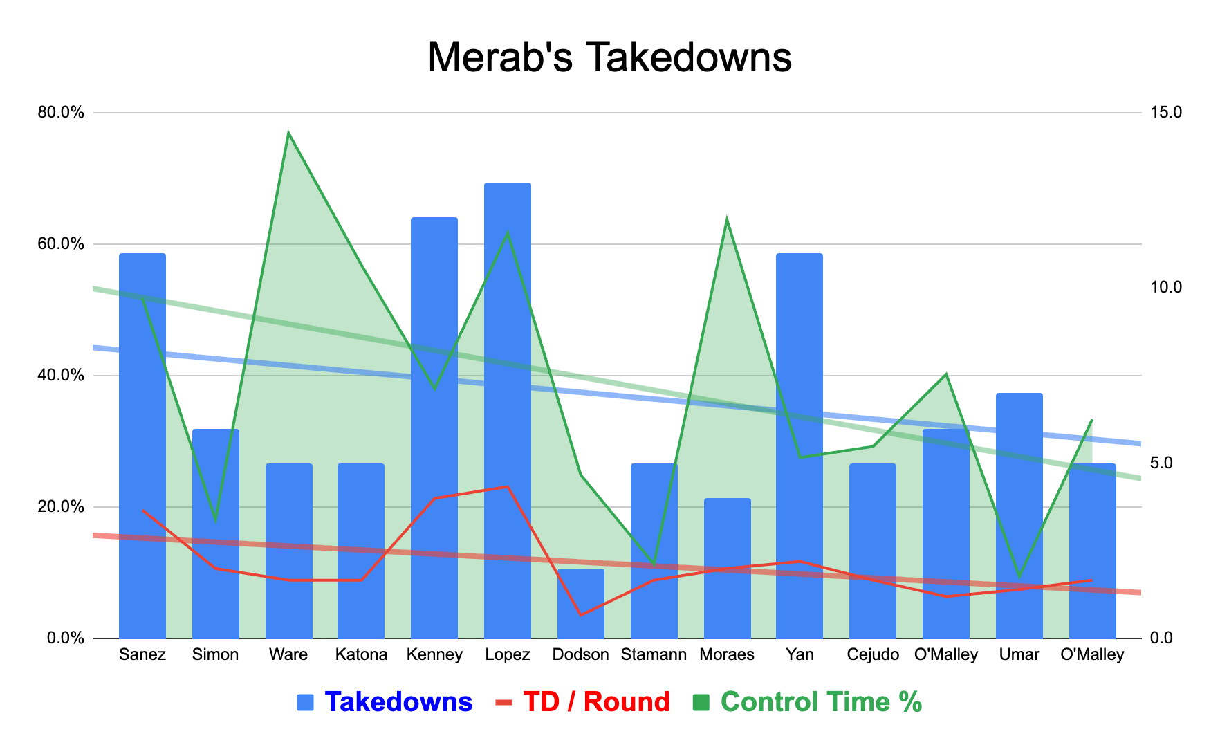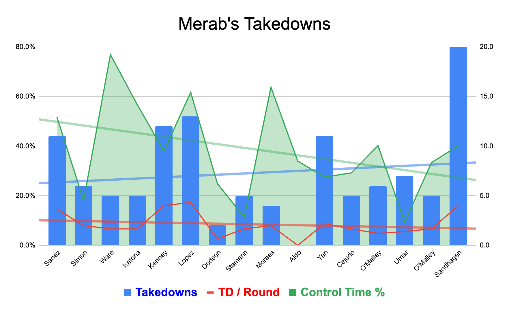 I found that Merab is actually grappling less and less. In the chart below you’ll see data points each with their own trend line.
