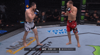 Yan hits Merab to the body with a left hook. Merab bounces out. Then he comes back with a right body kick and right straight. Merab throws another right to hide his level change so he can grab a single. Yan pushes Merab as he hops away to pull his leg out.