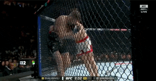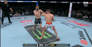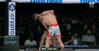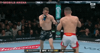 Merab catches Sandhagen’s body kick and throws a right. Cory eats it and hops back to stay up right. Merab runs forward and clotheslines Sandhagen with his right arm to put him down. Sandhagen turns over to turtle. Merab grabs a rear body lock and uses it to run Sandhagen down onto hands and knees.
