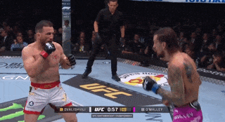 Merab runs in swinging wildly and falls into a double leg. O’Malley bounces off of the fence, pulls Merab up, and then digs his left arm in for an under hook. Merab switches to a single leg. O’Malley immediately pushes Merab’s hands below his knee so he can limp leg out and pop Merab on the exit.