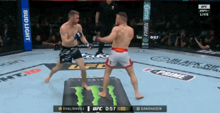 Merab a has a single. He shrugs Sandhagen by to get a rear body lock. Then he runs Sandhagen to the fence. Merab can’t get anything going so he switches back to the single leg. Sandhagen cross faces Merab and butt drags him to avoid getting taken down. Then he pops up to push Merab away, and get his leg back.