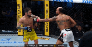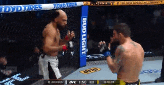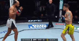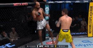 Johnson lands a right over Silva’s left. He slaps another right hook in to move toward the center of the cage. Both men trade punches that don’t land until Silva fakes a level change. Johnson covers up. Silva fakes again, Johnson covers, and then an uppercut splits Johnson’s guard. Johnson pulls Silva away from him to get off the cage. He seals the sequence by kicking Silva’s stomach.