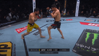 Park reads the double leg and gets a right under hook while pushing Silva’s face inside with his left hand. Silva lets go of the leg and eats a knee in the process. Silva backs off. Park lands about seven punches as he chases Silva. Silva gets away by throwing a front kick and running.