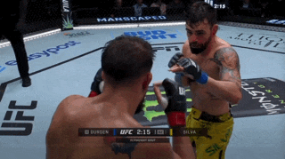 Silva jabs. Durden ducks into the right uppercut Silva was setting up. Durden falls to his butt. Durden can’t control Silva’s posture nor kick him away. Silva pounds on Durden for about 10 seconds before the referee calls it off.