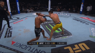 Van slips inside for a body hook and a front kick to the body. Silva falls over himself throwing a left cross. Van slides away for a two punch combo. Silva is out on his feet so Van pounces to put him away.