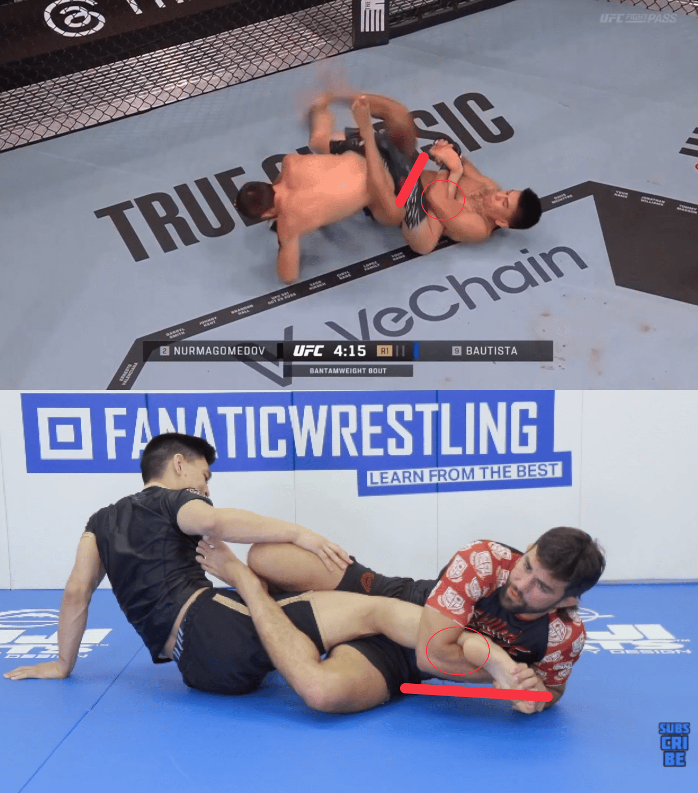 Umar pulls on Bautistas hips as he sits backwards and kicks his leg out to trip Bautista. When Bautista tries to turn away, Umar scoops his bottom leg and reaches over Bautista’s shoulder. Then he passes Bautista’s wrist to the over hook for gift wrap. Now Bautista is stuck on bottom with only one arm!
