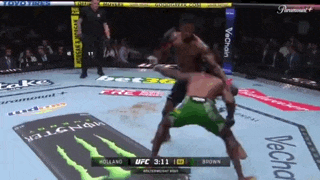 Holland is now relying on crunching Brown’s neck down while compressing his elbows to finishBrown’s head has slipped to the floor and his trapped elbow his high so he can open his arms and push off Holland to get inches of air