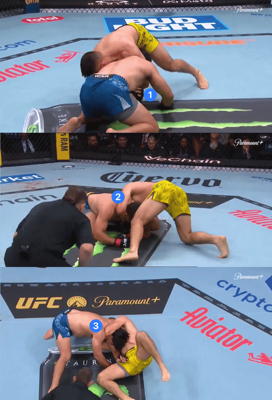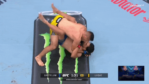 Luque elbows Gastelum. Gastelum responds with a triangle that Luque shrugs out of. Gastelum turns to turtle. Luque catches an anaconda choke. Luque immediately leans his weight over Gastelum’s trapped shoulder while pulling his choking arm into Gastelum’s neck. Then he drops onto his side to finish the submission.