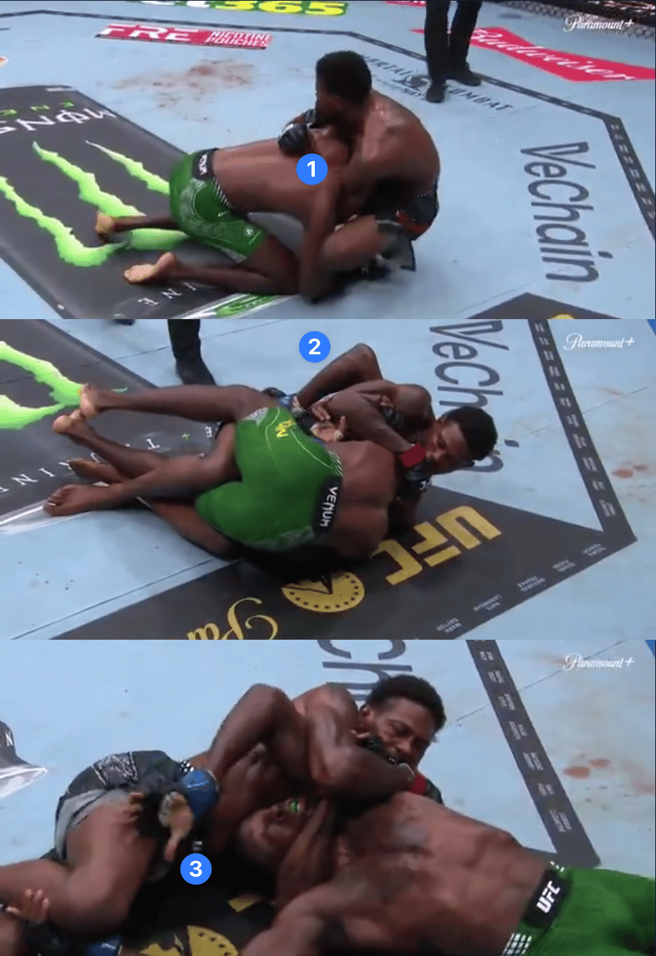 Luque is hanging his weight over Gastelum, pulling his left arm directly into Gastelum’s right carotid artery